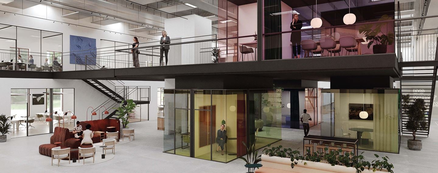 Kontorfællesskab med lyse lokaler og fælles kantine