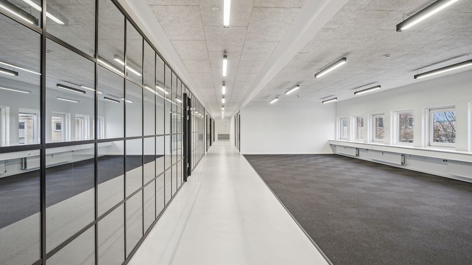 Lejemålet har fået nye tæppefliser i både kontorer og møderum, lys grå Conteco betongulve i fællesarealer og lyse troltekt loftplader monteret tæt på betonloftet for at sikre maksimal loftshøjde. Neurons har valgt flotte sorte linjelysarmaturer med dagslysstyring og lækre sprossede new yorker glasvægge