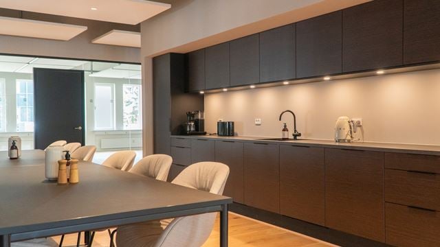 Når man træder ind i kontorfællesskabet, bliver man straks mødt af en følelse af ro og elegance. Denne stemning skabes gennem et nøje udvalgt tema, der binder lokalerne sammen. Hørkær 24 byder på en smuk kombination af varme træmøbler og trægulve, der giver rummet både karakter og varme.
