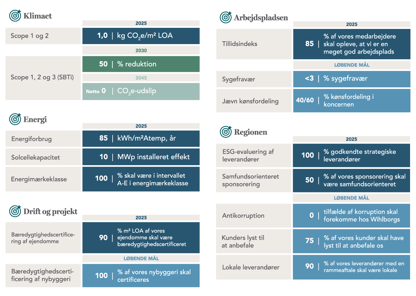 Vi har 16 bæredygtighedsmål, som bl.a. omfatter reducerede udledninger, energieffektivisering, ligelig kønsfordeling og certificerede bygninger.