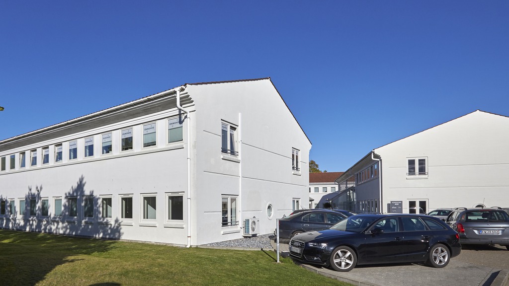 Velbeliggende erhvervsejendom i Holte med moderne udtryk, præsentable indgange og et charmerende gårdmiljø mellem de fire bygninger.