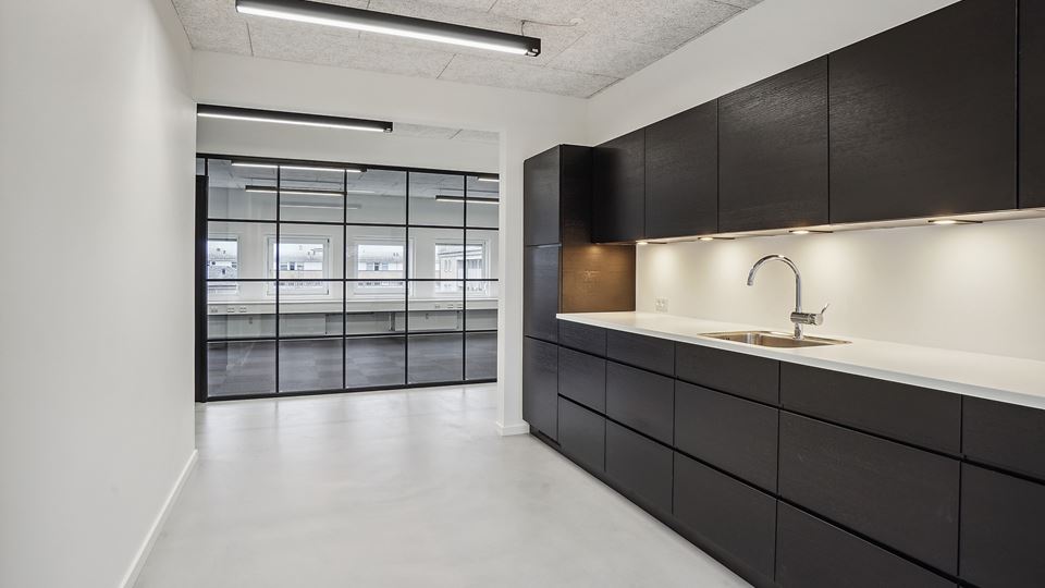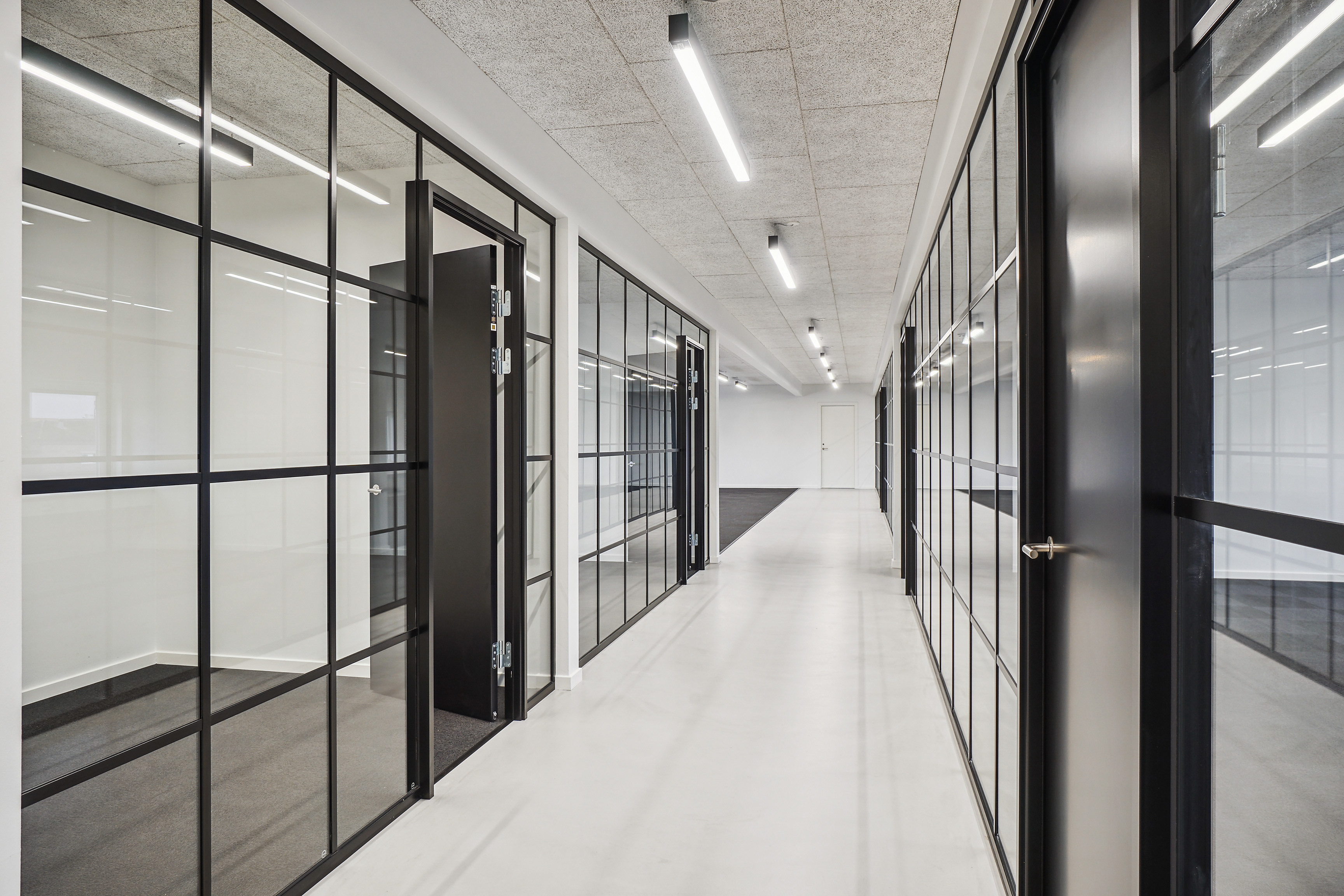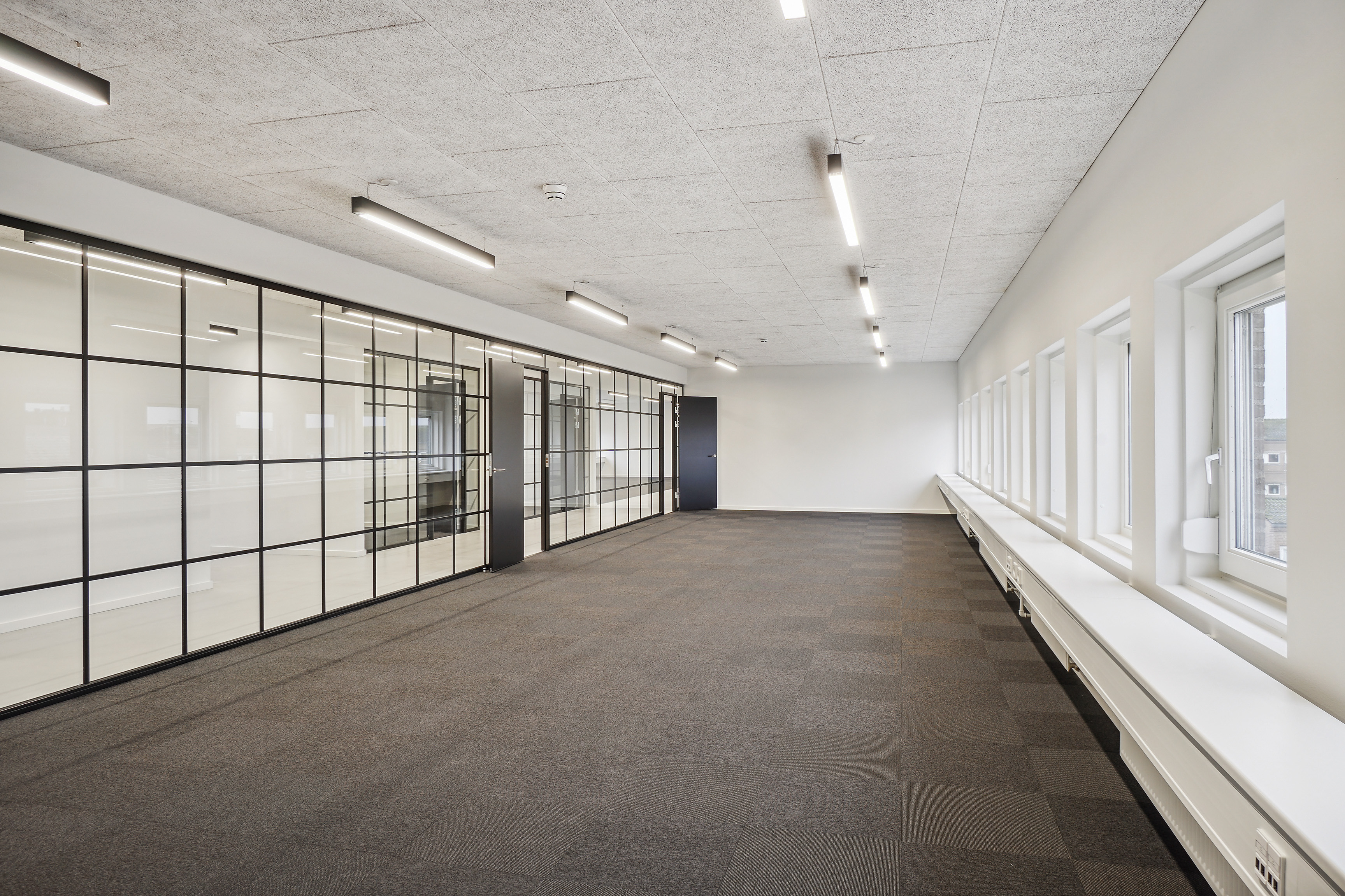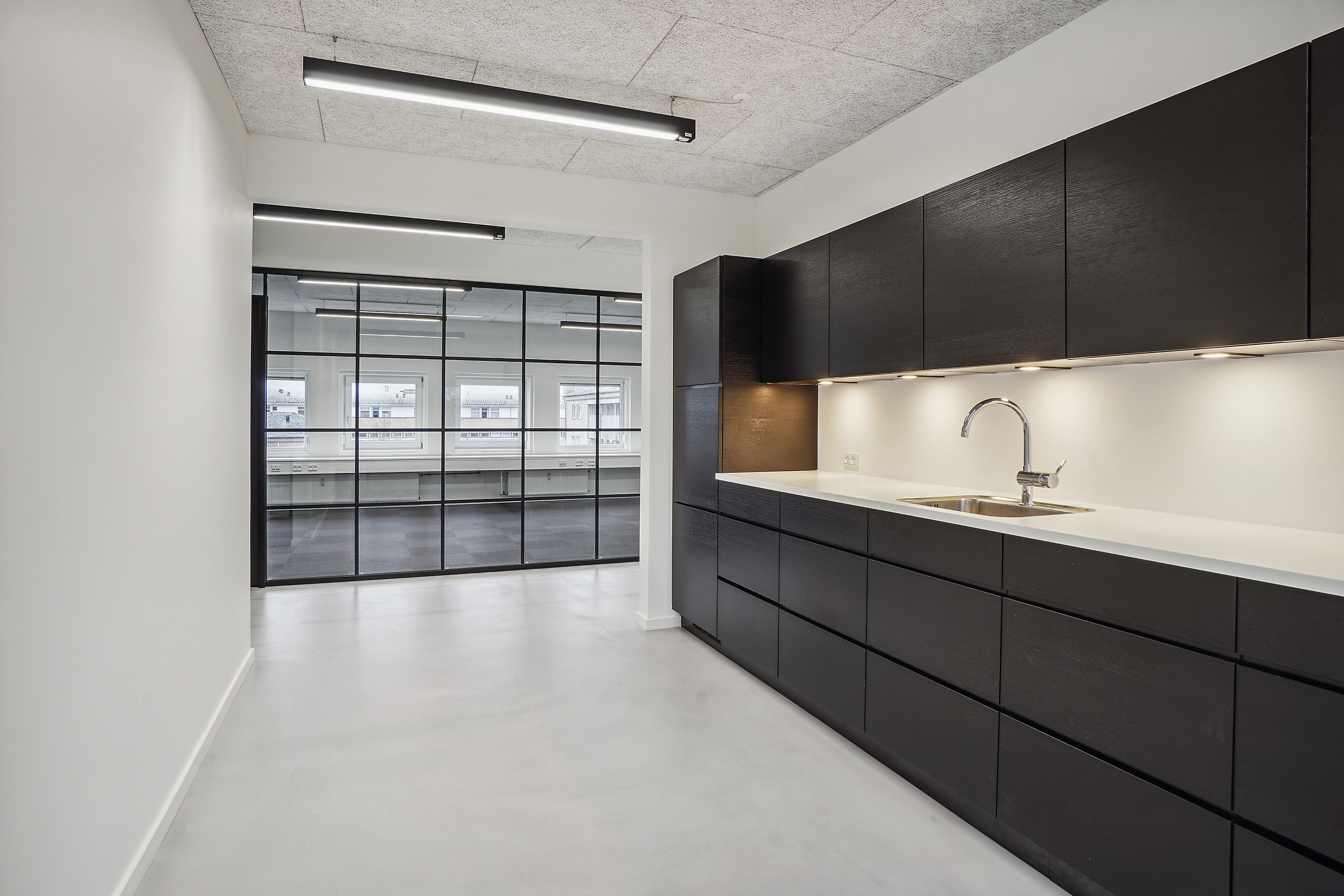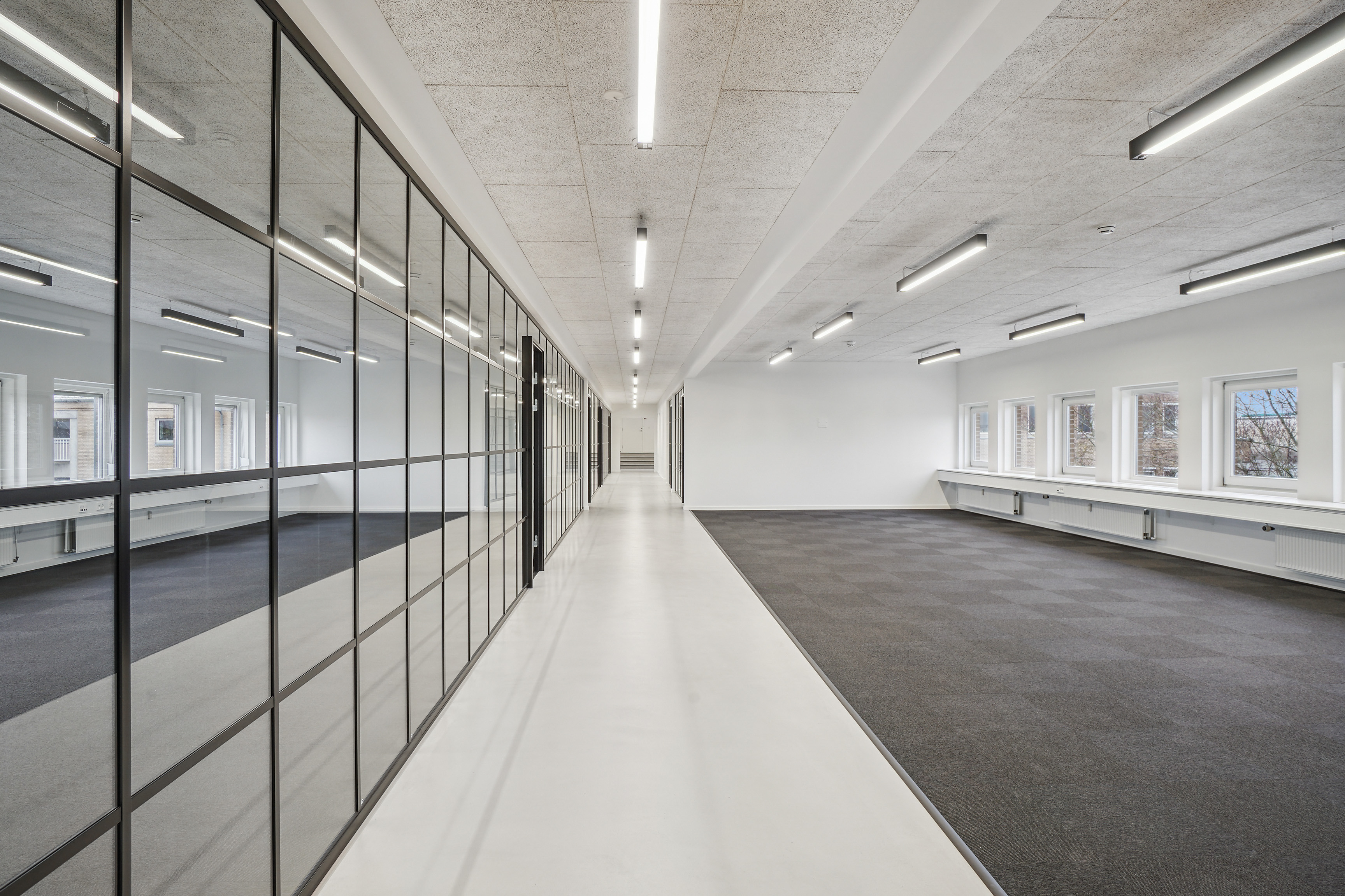 Lejemålet har fået nye tæppefliser i både kontorer og møderum, lys grå Conteco betongulve i fællesarealer og lyse troltekt loftplader monteret tæt på betonloftet for at sikre maksimal loftshøjde. Neurons har valgt flotte sorte linjelysarmaturer med dagslysstyring og lækre sprossede new yorker glasvægge