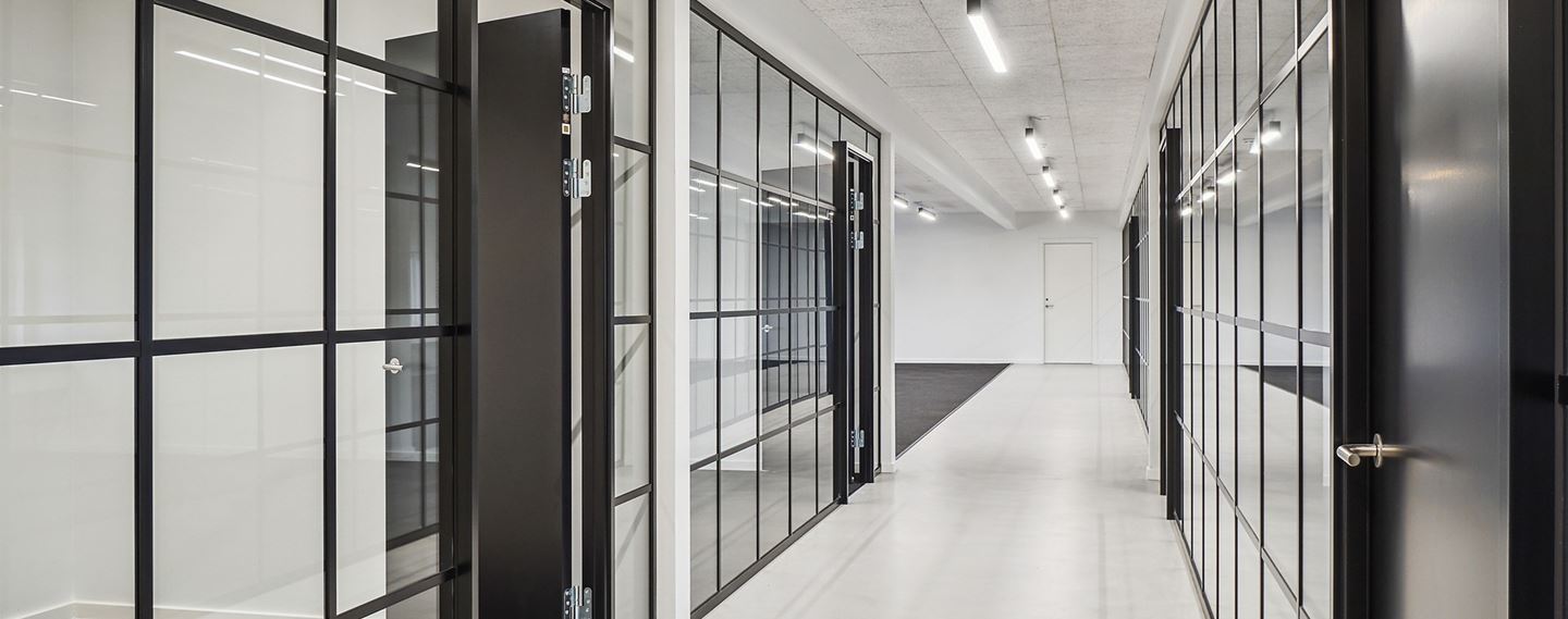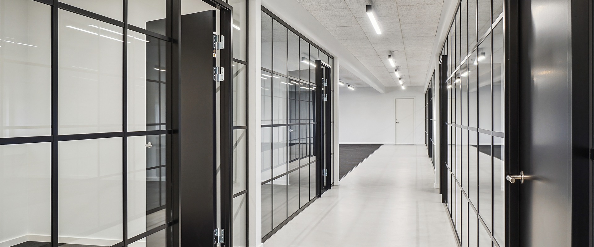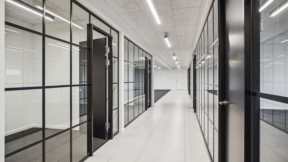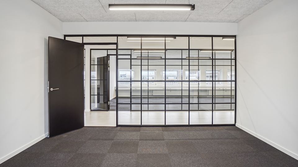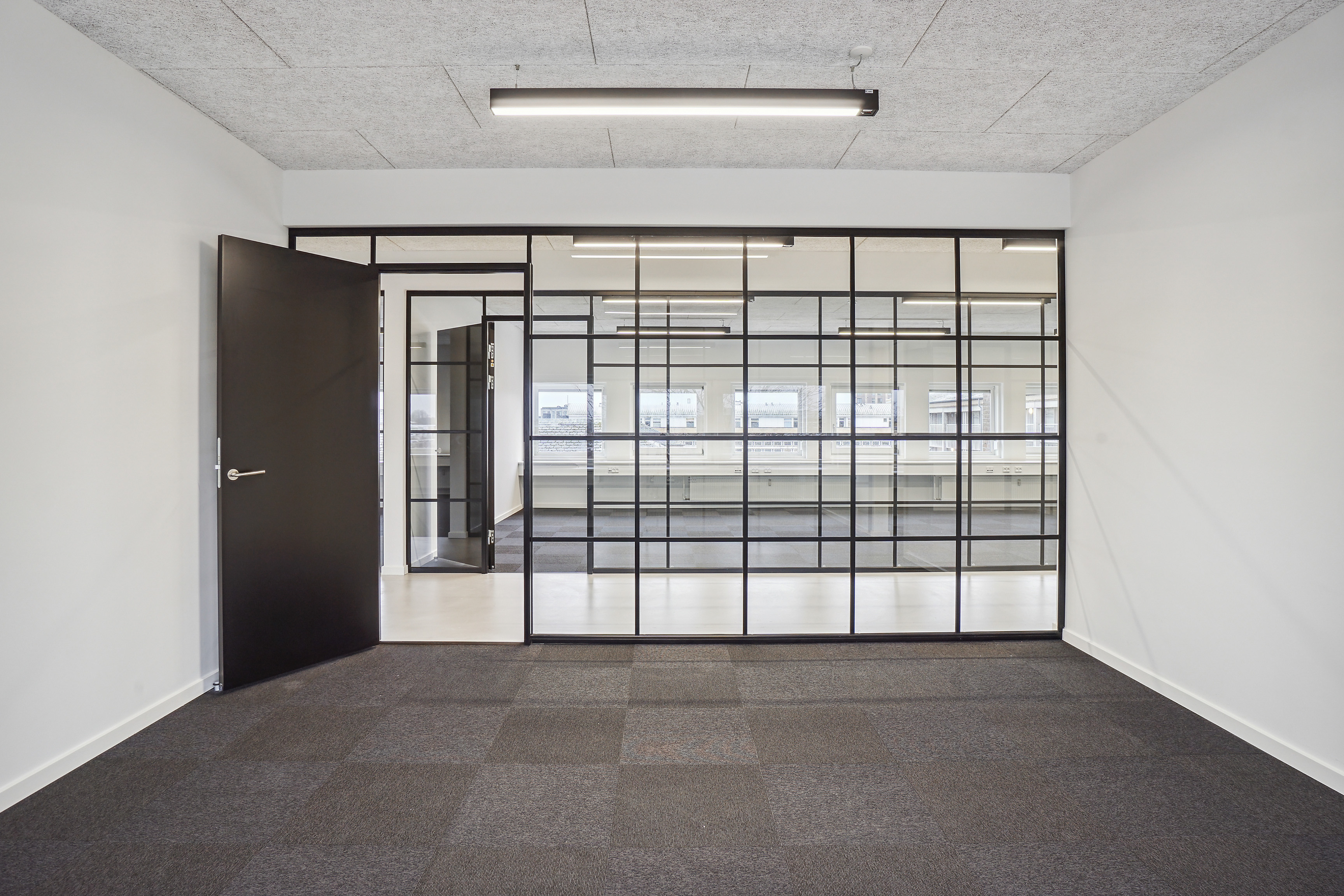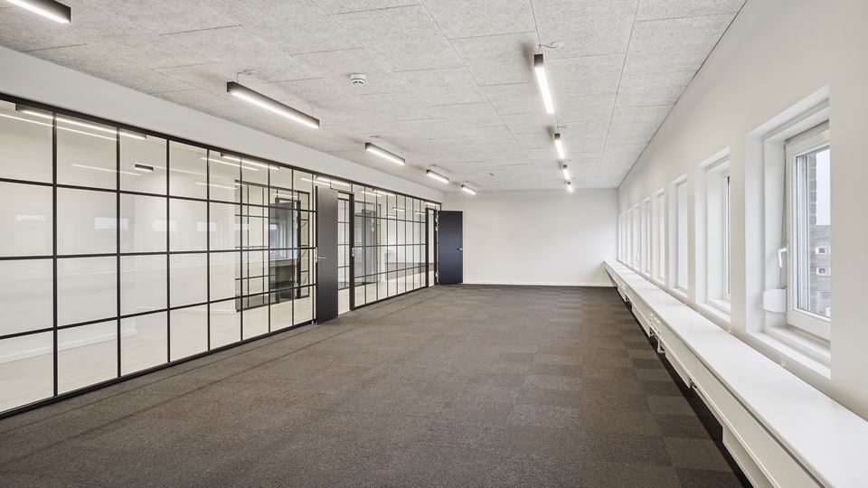 Lejemålet har fået nye tæppefliser i både kontorer og møderum, lys grå Conteco betongulve i fællesarealer og lyse troltekt loftplader monteret tæt på betonloftet for at sikre maksimal loftshøjde. Neurons har valgt flotte sorte linjelysarmaturer med dagslysstyring og lækre sprossede new yorker glasvægge