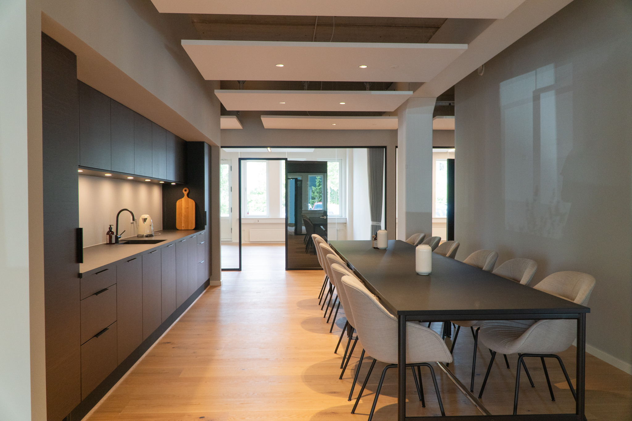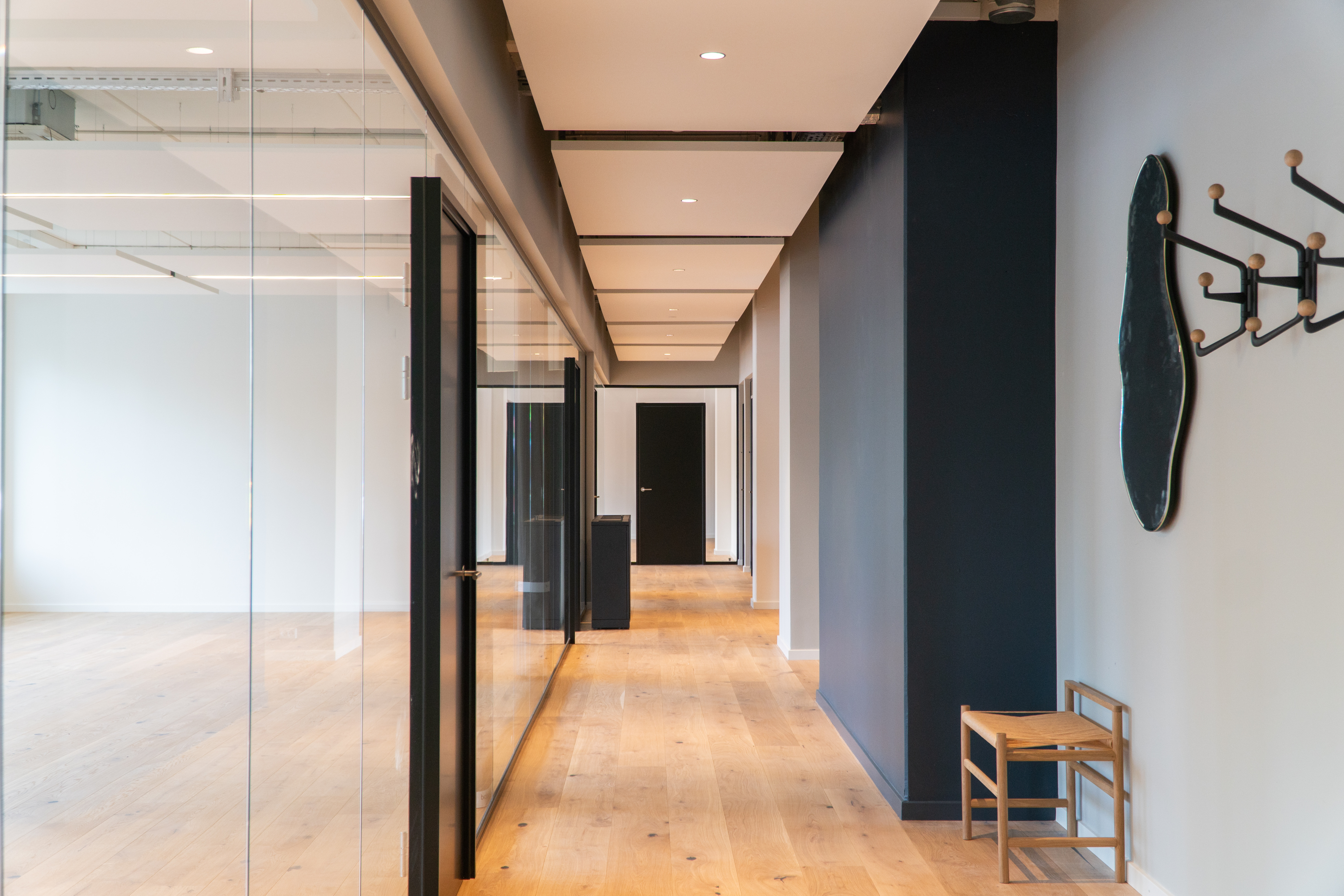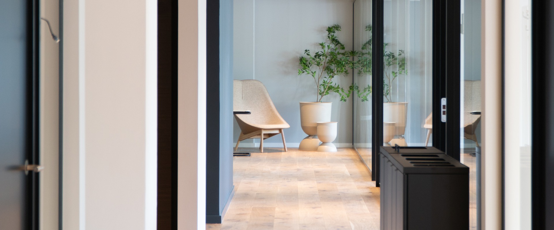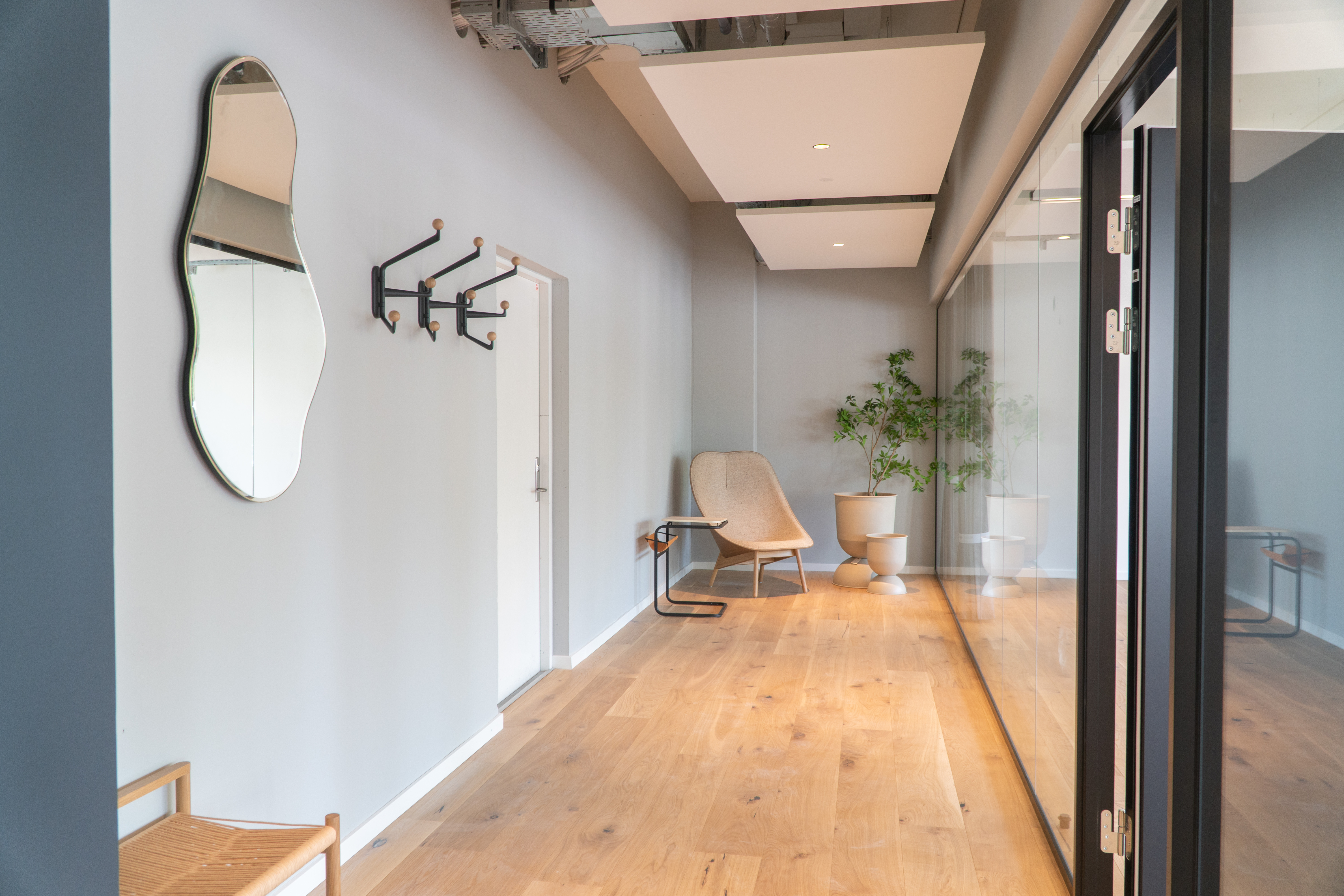 Når man træder ind i kontorfællesskabet, bliver man straks mødt af en følelse af ro og elegance. Denne stemning skabes gennem et nøje udvalgt tema, der binder lokalerne sammen. Hørkær 24 byder på en smuk kombination af varme træmøbler og trægulve, der giver rummet både karakter og varme.