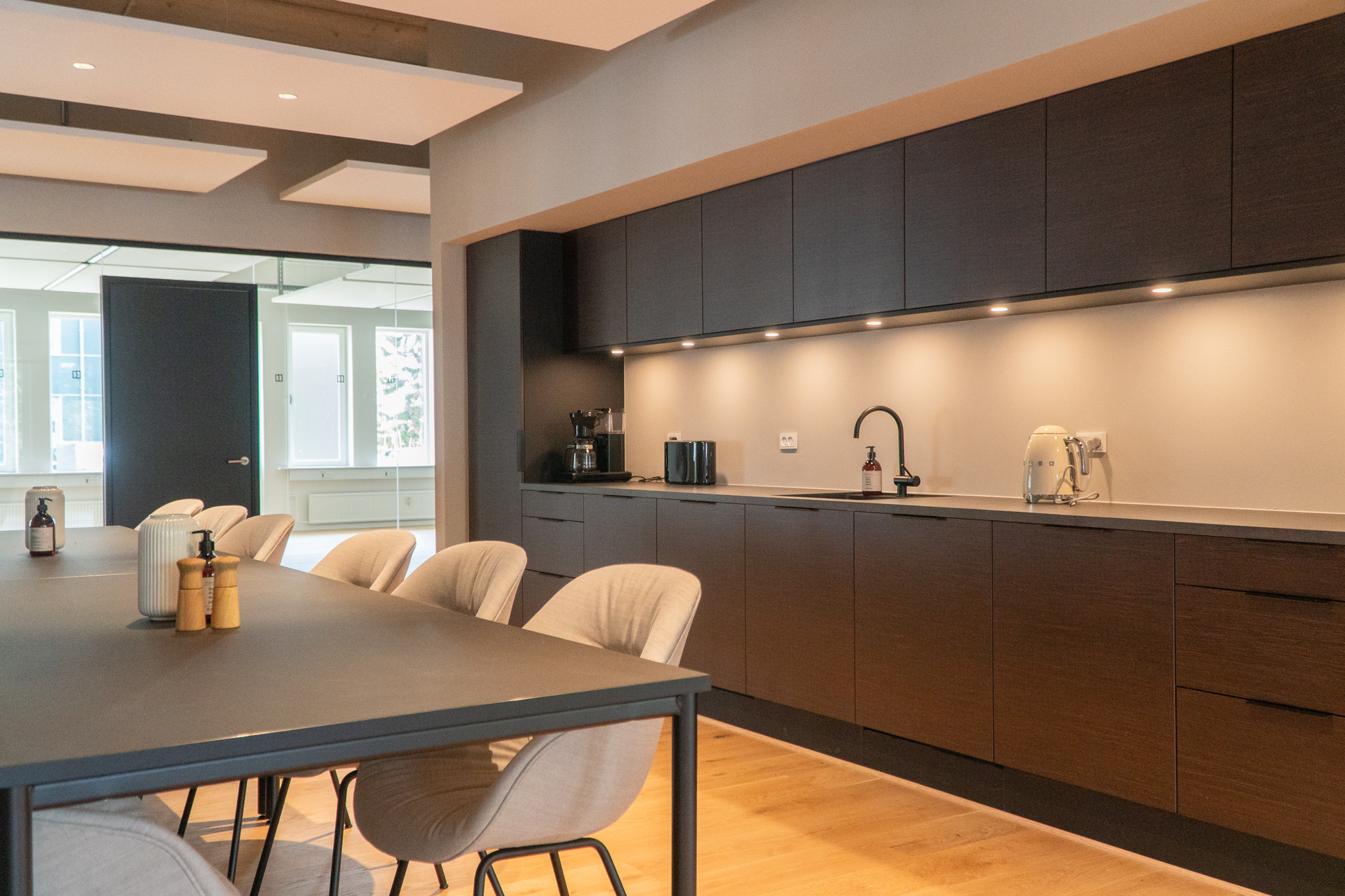 Mørke dekorationer, som tæpper og vægophæng, er med til at understøtte det stilfulde tema og skaber en harmonisk atmosfære, der fremmer ro og fokus. Den varme belysning spiller en central rolle i at fremhæve disse elementer og giver kontorfællesskabet et sofistikeret og indbydende udtryk.