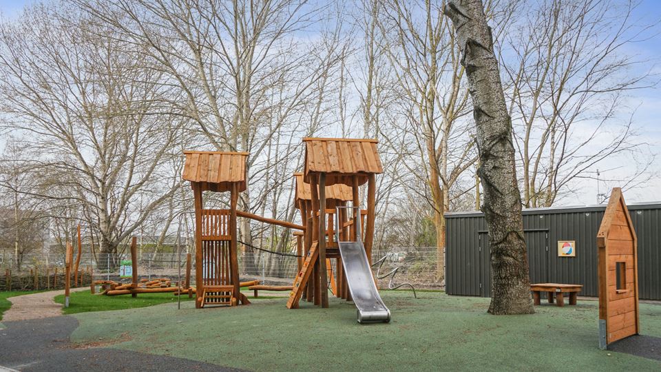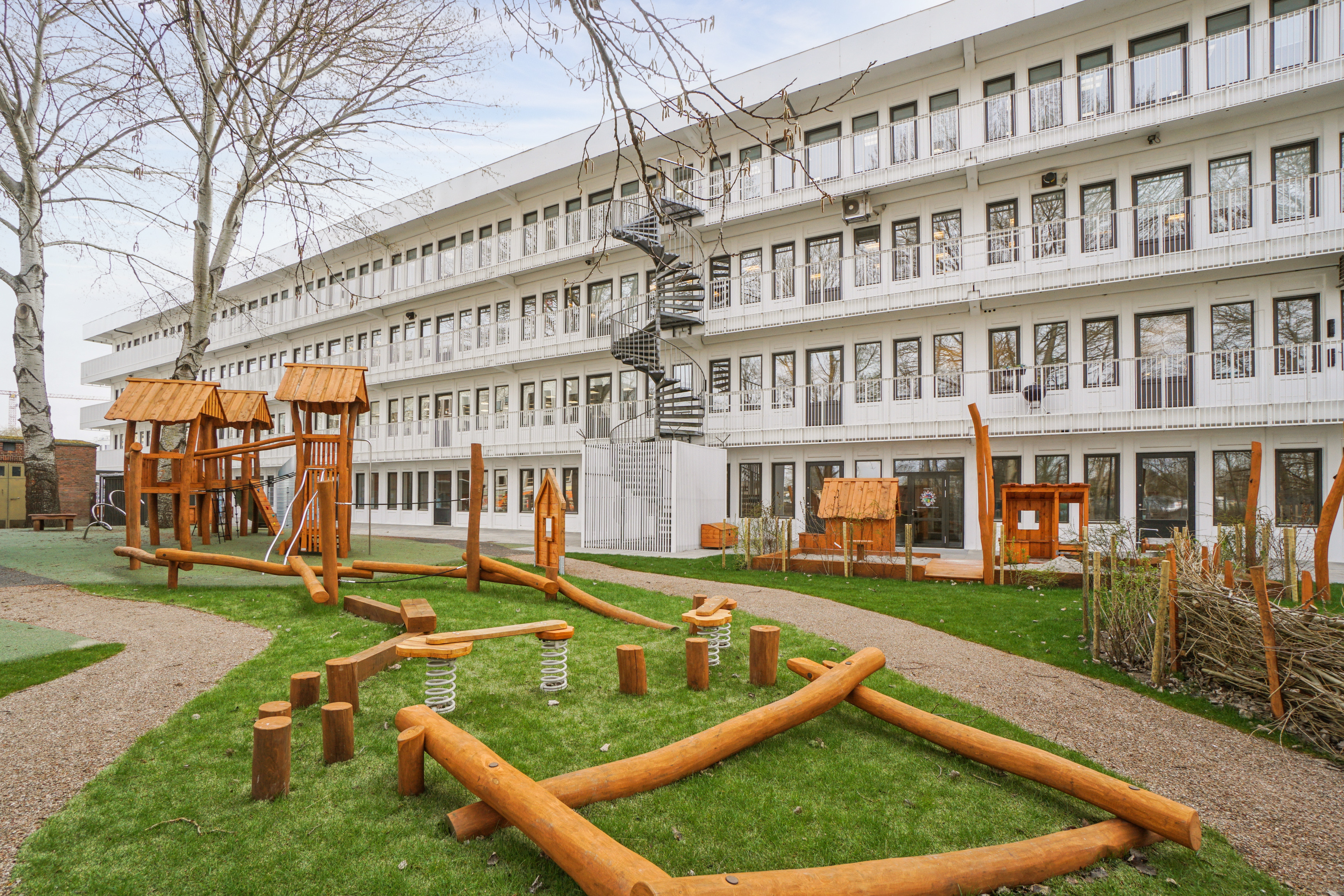 Daginstitution er lavet i et plan med direkte udgang til den nyoprettede naturlegeplads fra flere stuer. Der er gjort plads til både vuggestue og børnehave under samme tag, og så er den indrettet, så den er overskuelig for børnene i dagligdagen, og samtidig er der mulighed for at bruge fællesrummene til forskellige aktiviteter.