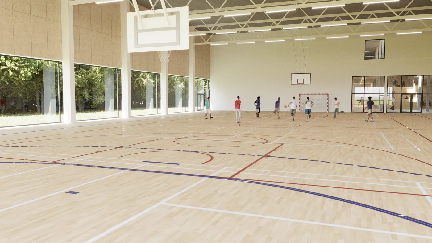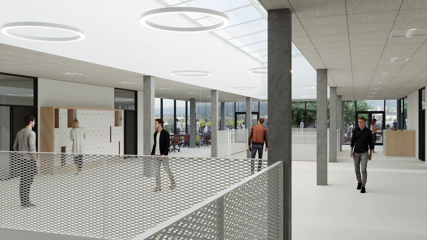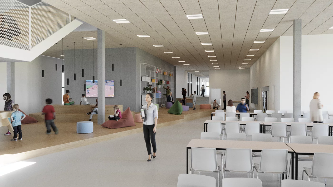 Indretning og funktioner - Skolens funktioner er centreret om et fællesrum og opdelt i mindre enheder for at skabe lokale tilhørsforhold. I stueetagen er der administration, indskolingsklasser, børnehave, SFO, aula, kantine, multihal og fitnessfaciliteter. De øvrige etager rummer klasseværelser, faglokaler og åbne læringsområder. Små klasseværelser sikrer fokus på den enkelte elev, mens faglokalerne understøtter gruppearbejde og praktiske aktiviteter.
